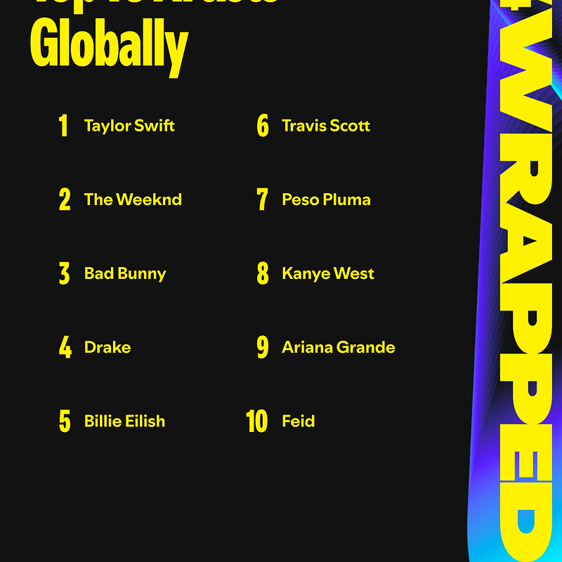 Mit mehr als 26,6 Milliarden Streams weltweit ist Taylor Swift 2024 zum zweiten Mal in Folge die meistgestreamte Künstler*in auf Spotify. Platz 2 geht an The Weeknd, gefolgt von Bad Bunny auf Platz 3. Platz 4 belegt Drake, gefolgt von Billie Eilish auf Platz 5. Das meistgestreamte Album des Jahres stammt ebenfalls von Taylor Swift: THE TORTURED POETS DEPARTMENT: THE ANTHOLOGY. Es folgen HIT ME HARD AND SOFT von Billie Eilish auf Platz 2 und Short n' Sweet von Sabrina Carpenter auf Platz 3. MAÑANA SERÁ BONITO von Karol G belegt Platz 4 der meistgestreamten Alben und eternal sunshine von Ariana Grande folgt auf Platz 5. Der international meistgestreamte Song des Jahres ist der Mega-Hit Espresso von Sabrina Carpenter mit über 1,6 Milliarden Streams weltweit allein in diesem Jahr. Auf den Plätzen 2 und 3 folgen Benson Boone mit Beautiful Things und Billie Eilish mit BIRDS OF A FEATHER, gefolgt von Gata Only von FloyyMenor und Cris Mj sowie Lose Control von Teddy Swims auf Platz 5.