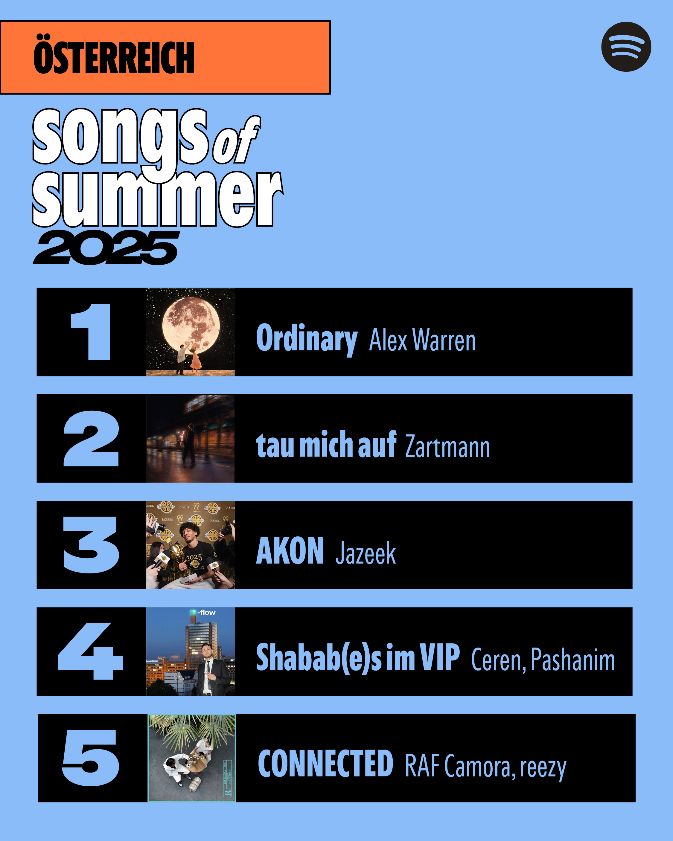 Während der Sommer langsam ausklingt, gibt Spotify mit den „Songs of Summer 2025“ einen Rückblick auf die Tracks, die Spotify Hörer*innen in Österreich durch den Sommer getragen haben. Die Top 5-Liste basiert auf den gestreamten Stunden in Österreich und zeigt, welche Songs die bisherigen Sommermomente der Hörer*innen bestimmten.