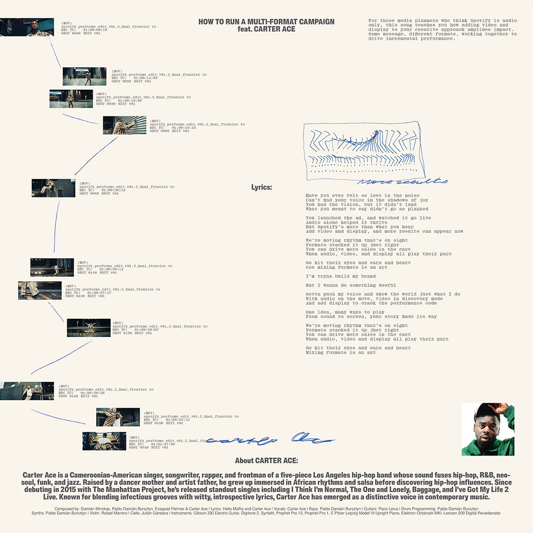 Neben der neuen Musik umfasst die Kampagne zwei animierte Musikvideos (How to Reach Your Target Audience feat. Parbleu | Spotify Ads, How to Drive ROI With Your Campaign Setup feat. Big Sis | Spotify Ads) und einen Live-Action-Film, produziert von FCB New York. Zudem gibt es eine limitierte Vinyl-Edition, die den Soundtrack zum Erfolg direkt in die Hände von Marken und Marketer*innen bringt. Jeder Track wird außerdem als 15- und 30-sekündiger Werbeclip adaptiert und auf Spotify, LinkedIn, Meta und YouTube ausgespielt.
