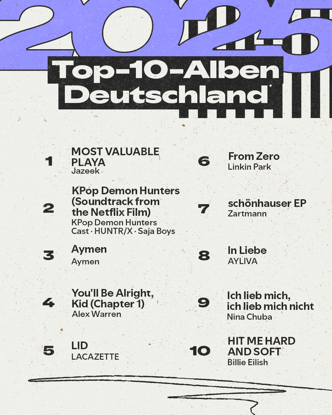 Bei den Top-Alben 2025 in Deutschland landet MOST VALUABLE PLAYA von Jazeek auf Platz 1: ein Zeichen für die Durchschlagskraft von R&B auf Deutsch und Hook-getriebenen Singles. Auf Platz 2 liegt auch in Deutschland der Soundtrack zum Animationsfilm KPop Demon Hunters. Newcomer Aymen landet mit melodischem Deutschrap auf Platz 3.