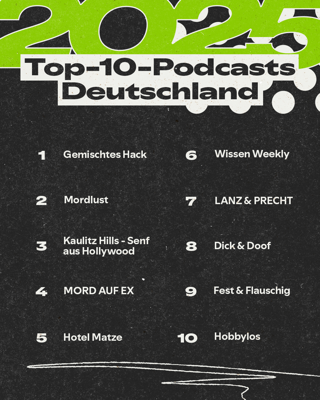 Gemischtes Hack holt erneut den ersten Platz der Top-Podcasts. Mit einer riesigen Community im Rücken und dank verlässlicher wöchentlicher Präsenz ist die auch als Video-Podcast verfügbare Show die unangefochtene Nummer 1 in Deutschland. Auf Platz 2 folgt Mordlust, ein True-Crime-Format mit fundierter Recherche und klarer Einordnung. Platz 3 belegt Kaulitz Hills - Senf aus Hollywood mit persönlichen Einblicken und bestem Entertainment von Bill und Tom Kaulitz.