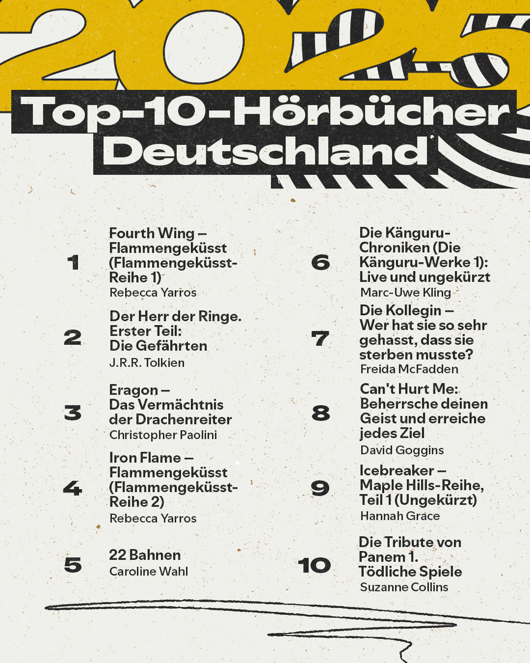 Hörbücher sind neu bei 2025 Wrapped: An der globalen Spitze steht als Top-Hörbuch Fourth Wing von Rebecca Yarros, eine romantische wie mitreißende Fantasy-Saga. Lights Out von Navessa Allen auf Platz 2 ist eine spannende Sci‑Fi/Fantasy mit starker Heldin. Rebecca Yarros sichert sich mit Iron Flame, dem zweiten Teil ihrer Fantasy-Reihe, auch Platz 3.