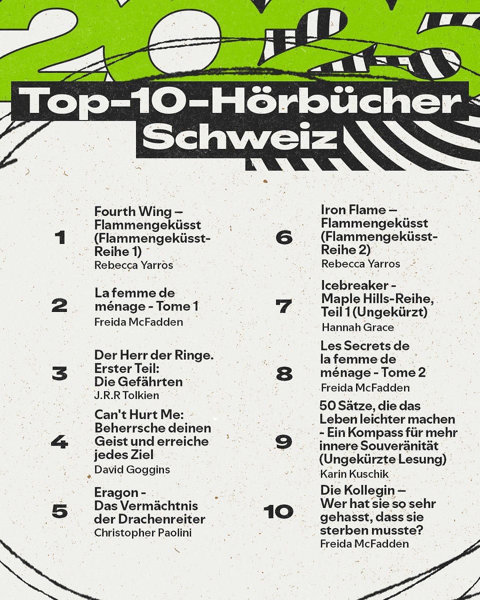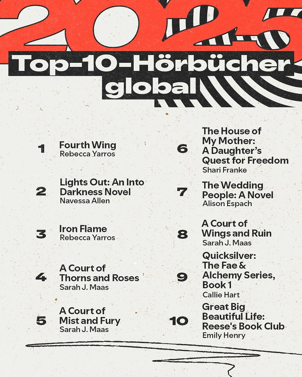 Hörbücher sind neu bei 2025 Wrapped: An der globalen Spitze steht als Top-Hörbuch Fourth Wing von Rebecca Yarros, eine romantische wie mitreißende Fantasy-Saga. Lights Out von Navessa Allen auf Platz 2 ist eine spannende Sci‑Fi/Fantasy mit starker Heldin. Rebecca Yarros sichert sich mit Iron Flame, dem zweiten Teil ihrer Fantasy-Reihe, auch Platz 3.