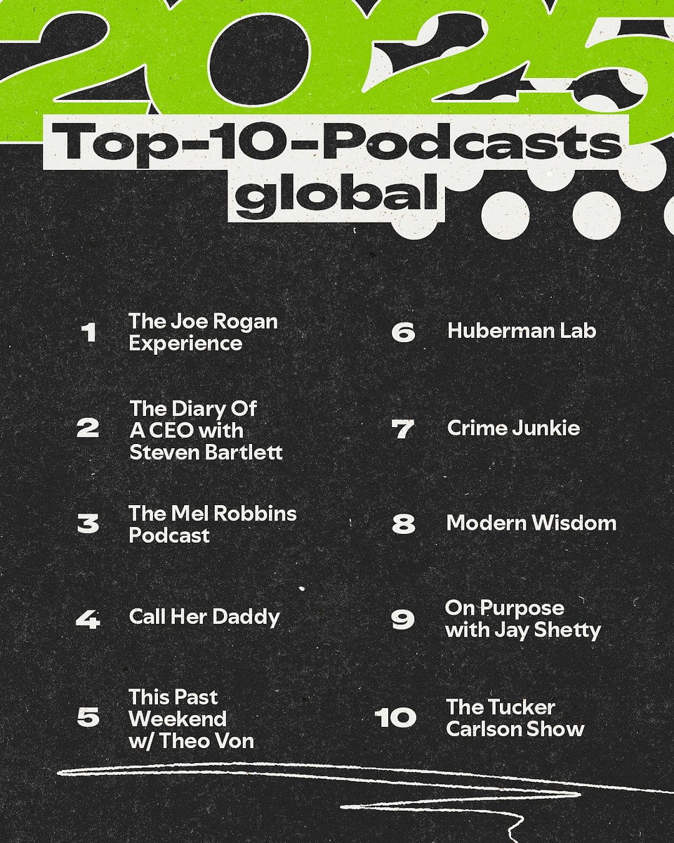 The Joe Rogan Experience führt bereits zum sechsten Mal in Folge die globalen Podcast-Charts an und holt sich den Titel des Top-Podcasts. Mit The Diary Of A CEO with Steven Bartlett auf Platz 2 und The Mel Robbins Podcast auf Platz 3 gibt das Siegertreppchen Einblicke in anhaltende Podcast-Trends: Business-Insights, Self-Improvement, persönliche Gespräche und tiefergehende Themen.