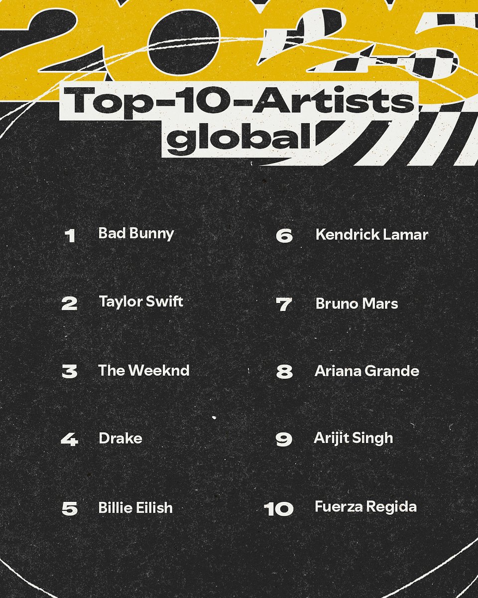 Bad Bunny ist 2025 globaler Top-Künstler– sein vierter Titel nach 2020, 2021 und 2022 unterstreicht den anhaltenden Einfluss von Latin weltweit. Dahinter prägt Taylor Swift auf Platz 2 mit hymnischen Midtempo-Songs das Feld, während The Weeknd mit Synth‑Pop und R&B die Top-3 komplettiert.