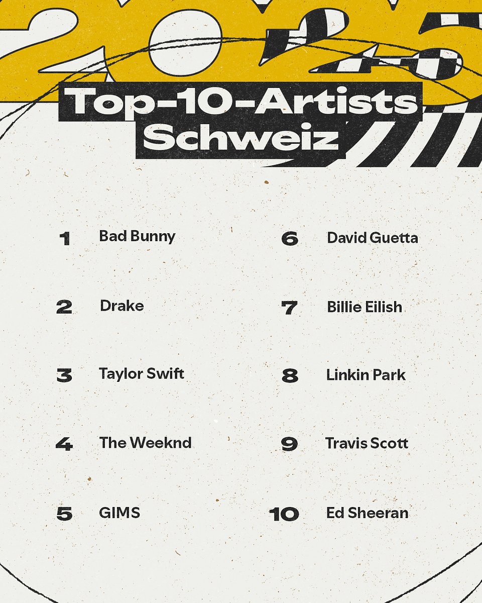 - Die vollständige Liste der Top-Künstler*innen in der Schweiz gibt es in der Playlist „Top Artists 2025 Switzerland“.