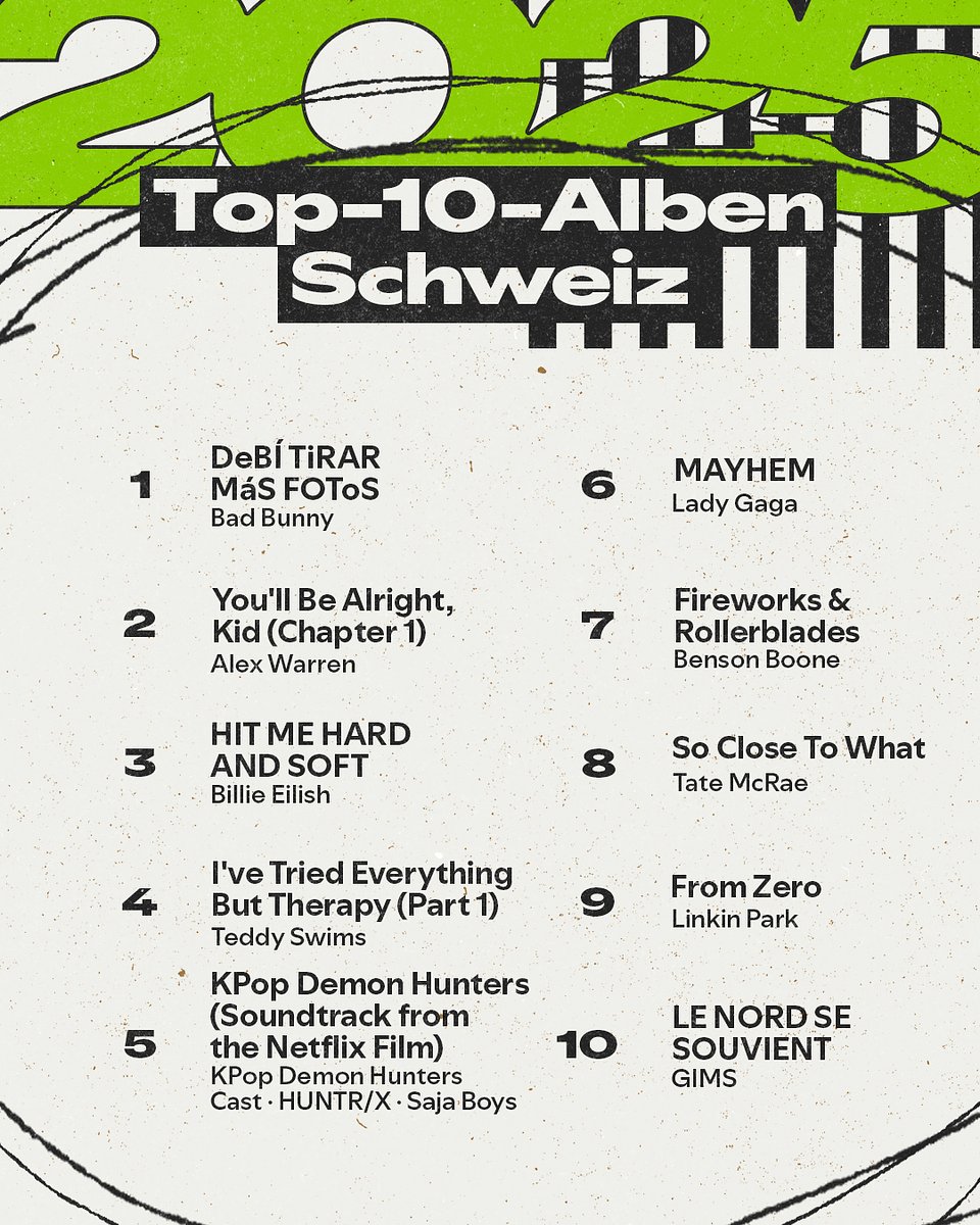 Und ein weiterer Sieg für Bad Bunny: Auch bei den Top‑Alben 2025 in der Schweiz holt er mit DeBÍ TiRAR MáS FOToS den Sieg – ein Release, der Latin‑Beats mit Pop‑Hooks und seiner puerto-ricanischen Heritage verbindet. Dahinter sichert sich Alex Warren mit You’ll Be Alright, Kid (Chapter 1) Platz 2 und bestätigt sein Momentum als internationaler Pop‑Newcomer. HIT ME HARD AND SOFT von Billie Eilish auf Platz 3 steht für atmosphärischen Pop zwischen Intimität und Größe.