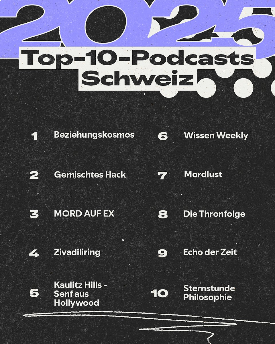 Die Top-Podcasts der Schweiz führt Beziehungskosmos auf Platz 1 an – ein Format, das Beziehungsthemen alltagsnah und reflektiert beleuchtet. Dahinter folgt Gemischtes Hack auf Platz 2 als Comedy‑Dauerbrenner mit riesiger Community. Platz 3 belegt MORD AUF EX – True Crime mit besonders erzählerischem Drive.