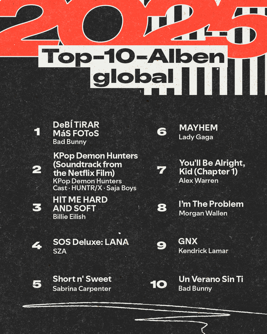 Auch beim Top-Album setzt sich Bad Bunny durch: DeBÍ TiRAR MáS FOToS führt vor dem Original-Soundtrack des Films KPop Demon Hunters (Soundtrack from the Netflix Film) und HIT ME HARD AND SOFT von Billie Eilish.