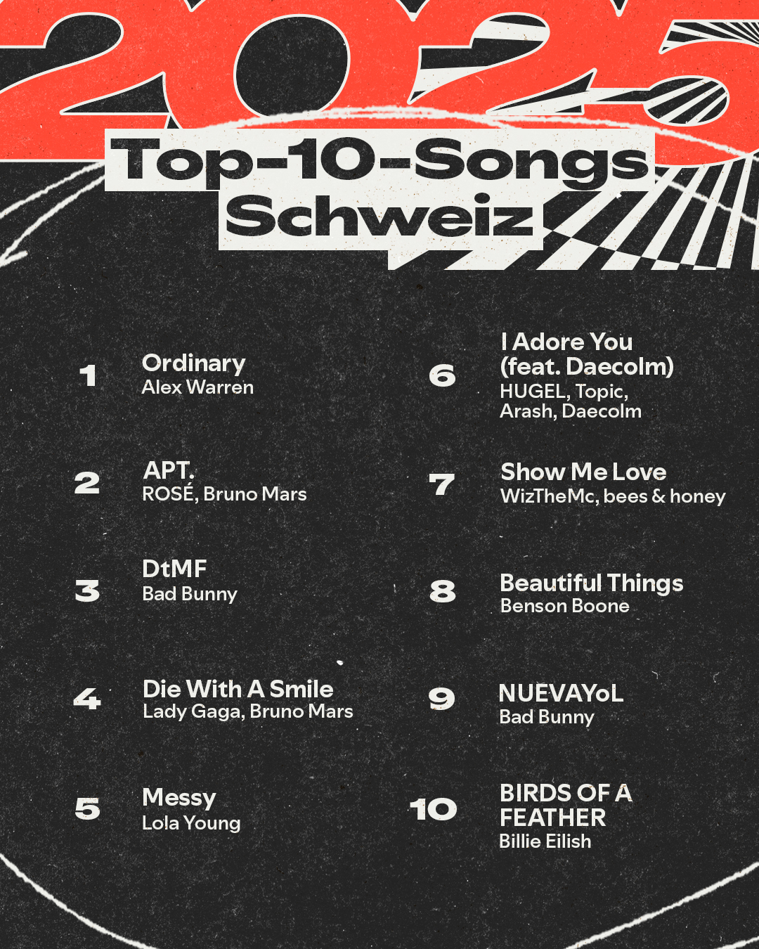 - Die vollständige Liste der Top-Songs in der Schweiz gibt es in der Playlist „Top Tracks 2025 Switzerland“.