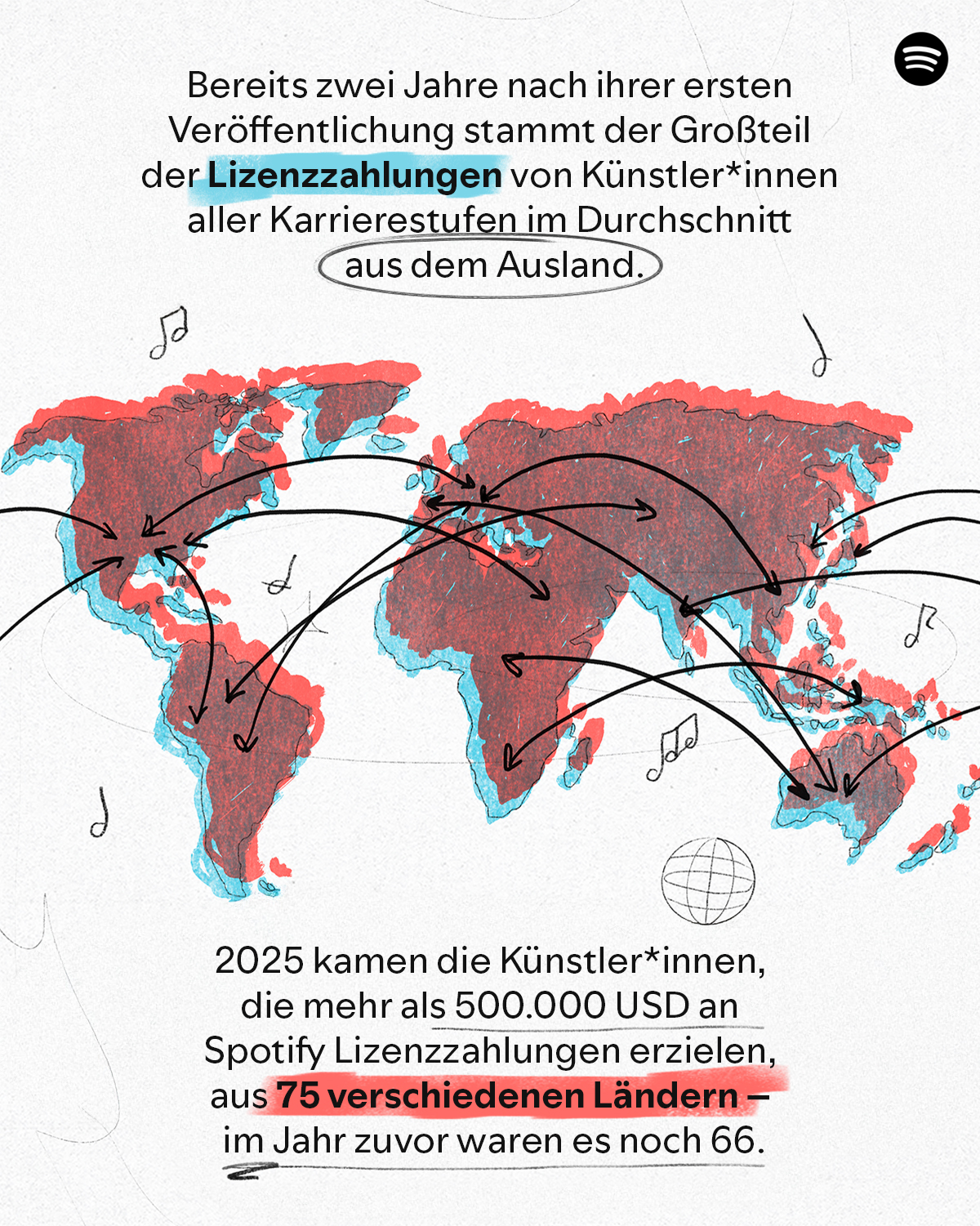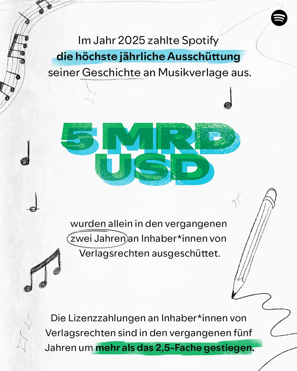 - Neue Rekorde für Songwriter*innen: Das Jahr 2025 markiert die höchste jährliche Ausschüttung an Musikverlage in der Geschichte von Spotify. Allein in den vergangenen zwei Jahren zahlte Spotify rund 5 Milliarden US-Dollar an Verlage und Organisationen, die Songwriter*innen vertreten.