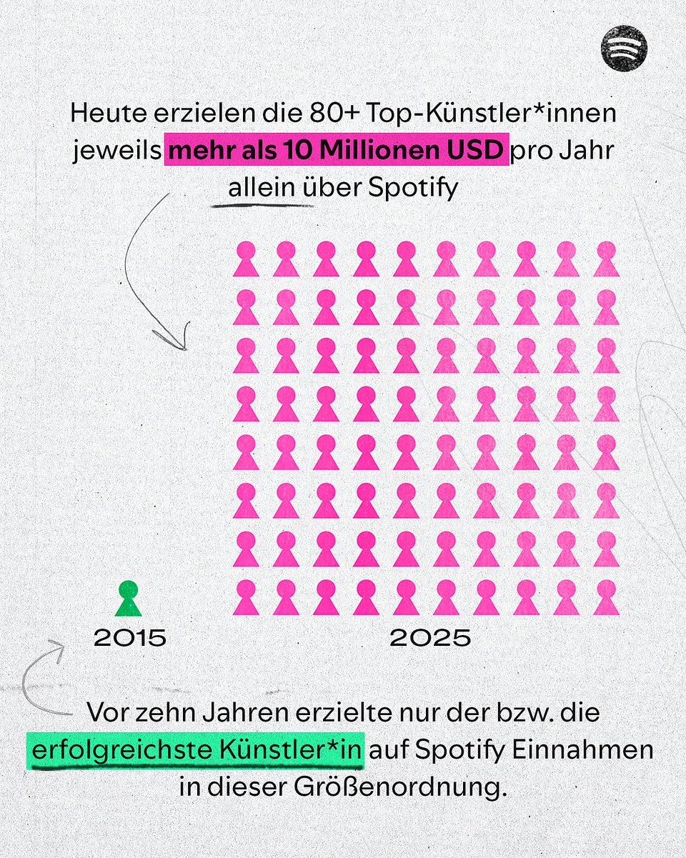 - Millionen-Dollar-Karrieren: Vor einem Jahrzehnt erreichte der bzw. die erfolgreichste Künstler*in auf Spotify erstmals 10 Millionen US-Dollar an jährlichen Lizenzzahlungen. Heute erzielen die 80 erfolgreichsten Künstler*innen jeweils mehr als 10 Millionen US-Dollar pro Jahr allein über Spotify.
