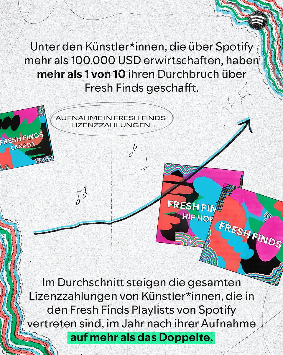 - Von Fresh Finds zu sechsstelligen Einnahmen: Mehr als 1 von 10 Künstler*innen, die heute über 100.000 US-Dollar pro Jahr auf Spotify erwirtschaften, wurde zum ersten Mal in eine der Fresh Finds Playlists aufgenommen. Das entspricht mehr als 1.600 Künstler*innen, deren Karrieren Spotify früh unterstützt hat und die seitdem sechsstellige Einnahmen erzielen.
