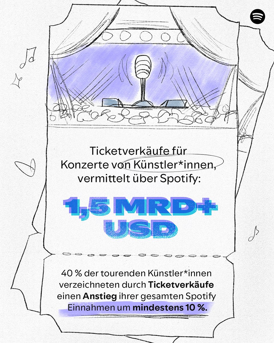 - 1,5 Milliarden Dollar an Ticketverkäufen: Im ersten Halbjahr 2025 hat Spotify zu einer Milliarde US-Dollar an Brutto-Ticketverkäufen für Konzerte von Künstler*innen beigetragen. Inzwischen übersteigt dieser Wert 1,5 Milliarden US-Dollar.