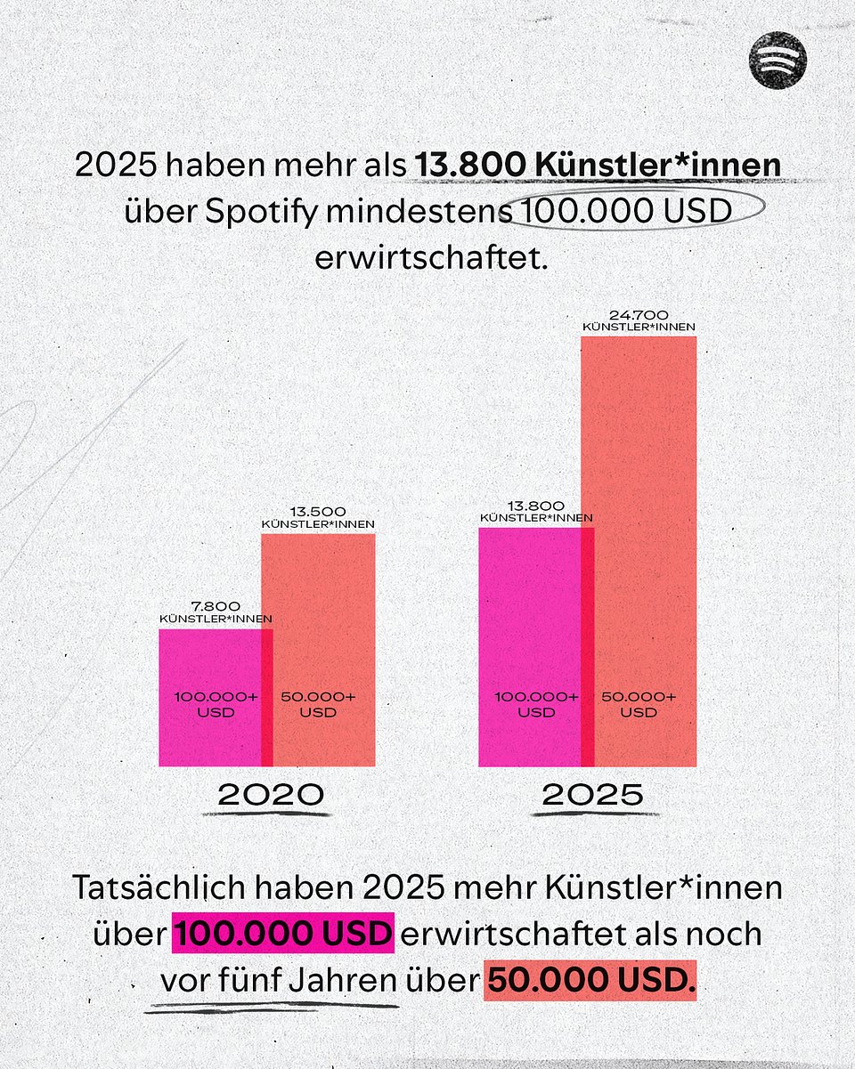 - Die neue Riege der 100.000-US-Dollar-Künstler*innen: Im Jahr 2025 gab es mehr als 13.800 Künstler*innen, die allein über Spotify mindestens 100.0001 US-Dollar pro Jahr erwirtschafteten – das sind fast 1.400 mehr als im Vorjahr. Tatsächlich ist die Zahl der Künstler*innen, die 2025 mehr als 100.000 US-Dollar erwirtschafteten, höher als die Zahl derer, die vor fünf Jahren mehr als 50.000 US-Dollar erzielten.