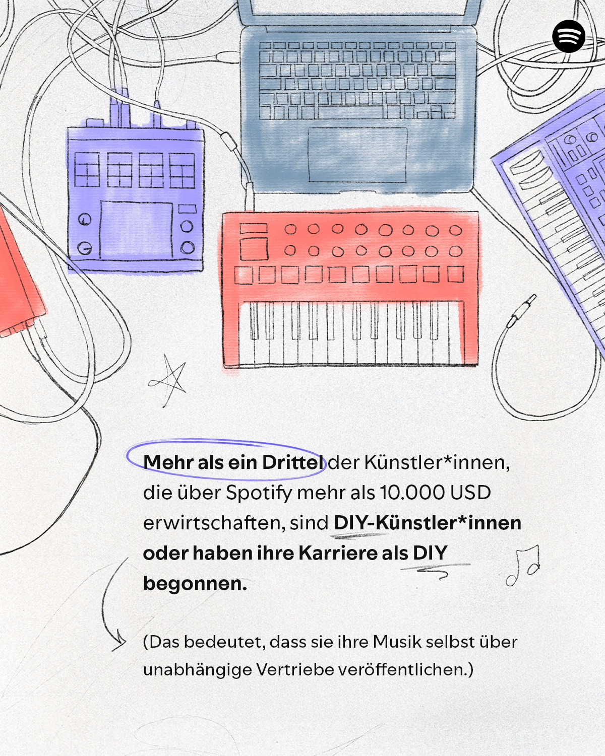- Der DIY-Weg zur Langzeit-Karriere: Im vergangenen Jahr waren mehr als ein Drittel der Künstler*innen, die 10.000 US-Dollar oder mehr an Lizenzzahlungen über Spotify erzielen, „Do it Yourself“ (DIY)-Künstler*innen oder haben ihre Karriere als DIY-Künstler*innen begonnen, sprich: Sie veröffentlichen ihre Musik selbst über unabhängige Vertriebe.