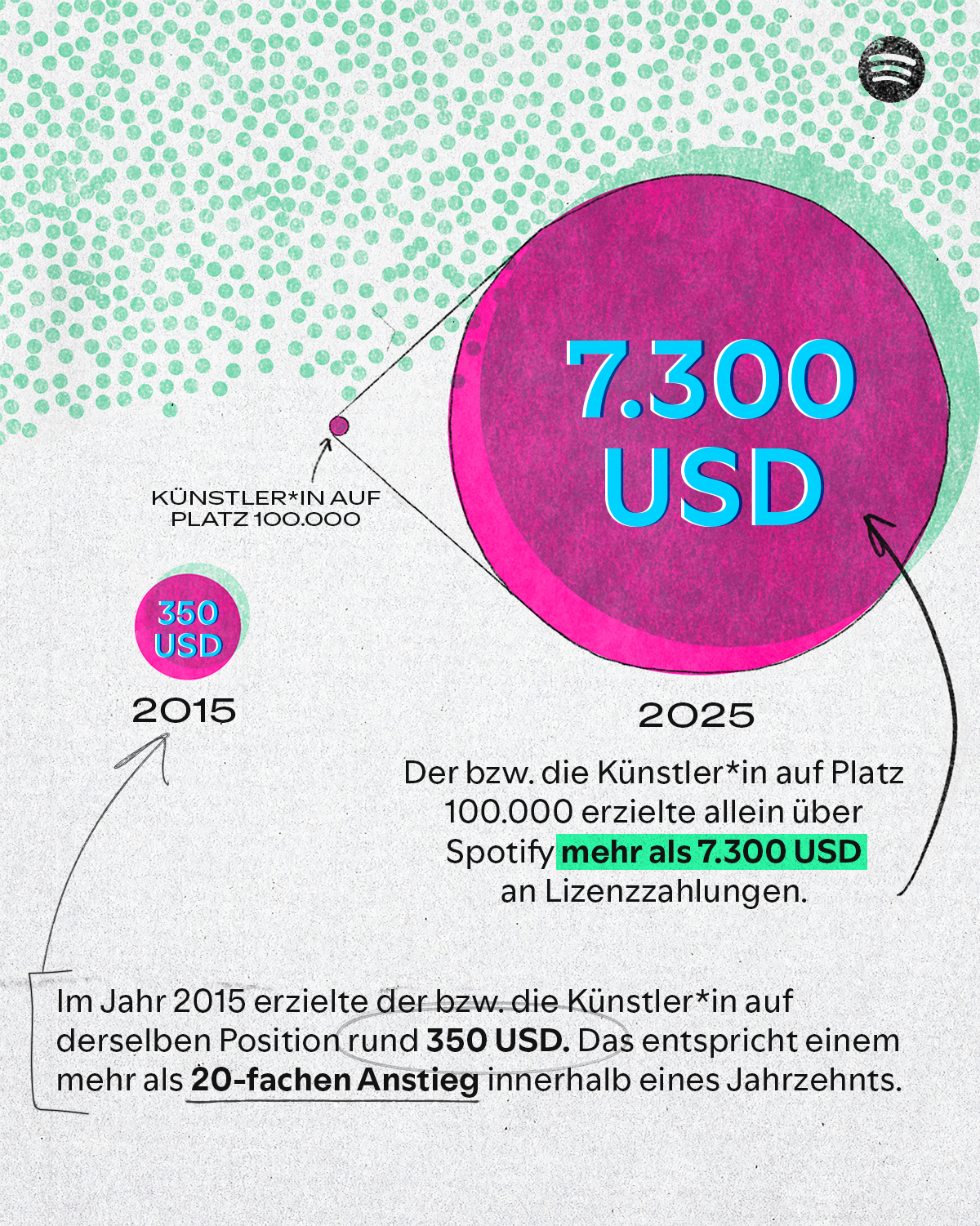 - Der Aufstieg von Platz 100.000: Der bzw. die Künstler*in auf Platz 100.000 der höchsten Einnahmen erzielte im Jahr 2025 allein über Spotify mehr als 7.300 US-Dollar an Lizenzzahlungen. Im Jahr 2015 wurden auf derselben Position rund 350 US-Dollar erzielt – das ist mehr als eine Verzwanzigfachung innerhalb eines Jahrzehnts.