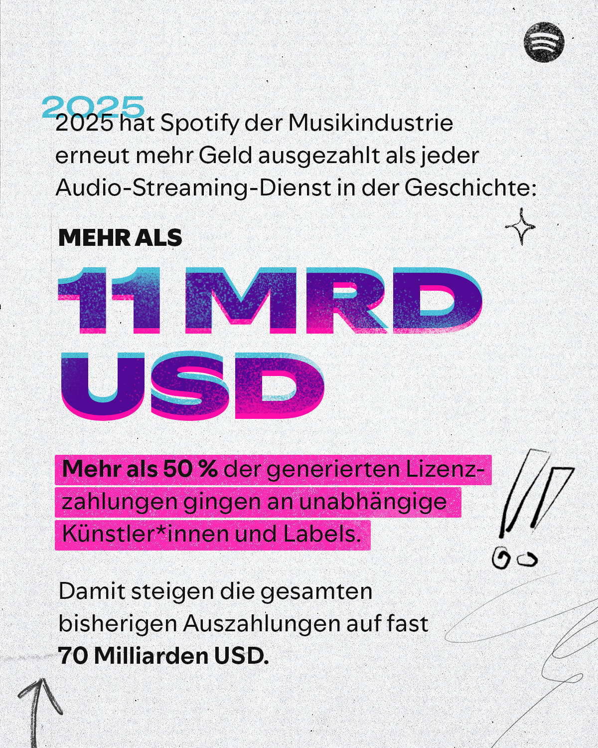 - Der 11-Milliarden-Dollar-Wachstumsmotor: Auch im Jahr 2025 war Spotify der Audio-Streaming-Dienst mit den weltweit höchsten Auszahlungen – und schüttete mehr als 11 Milliarden US-Dollar an die Musikindustrie aus. Damit steigen die gesamten bisherigen Auszahlungen seit der Gründung von Spotify auf fast 70 Milliarden US-Dollar. Und: Diese Summe wächst weiter.