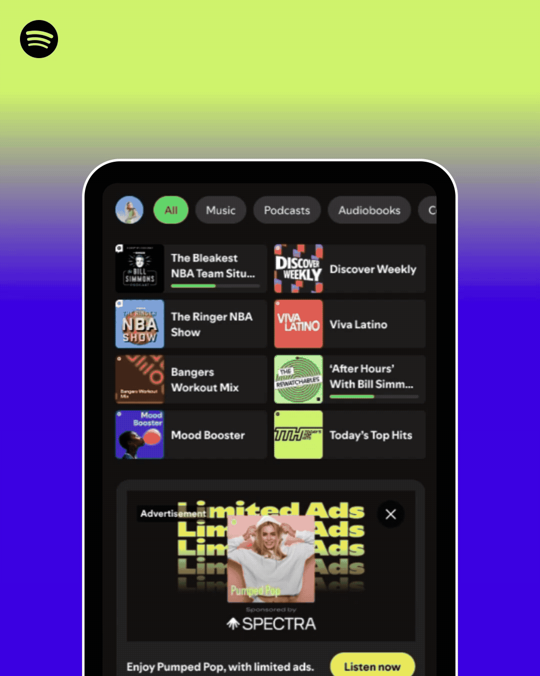 Mehr Zeit in der App, mehr aktive Nutzung, mehr Werbewirkung: Die Neuerungen im Bereich Werbemonetarisierung für Spotify Free im vergangenen Jahr haben die Klickraten für Audio- und Video-Ads um 14 Prozent gesteigert.1 Nun legt Spotify nach: Mit neuen Formaten und smarten Kampagnen-Tools gibt das Unternehmen Werbetreibenden neue Möglichkeiten an die Hand, dieses gestiegene Engagement direkt für ihre Kampagnen zu nutzen.