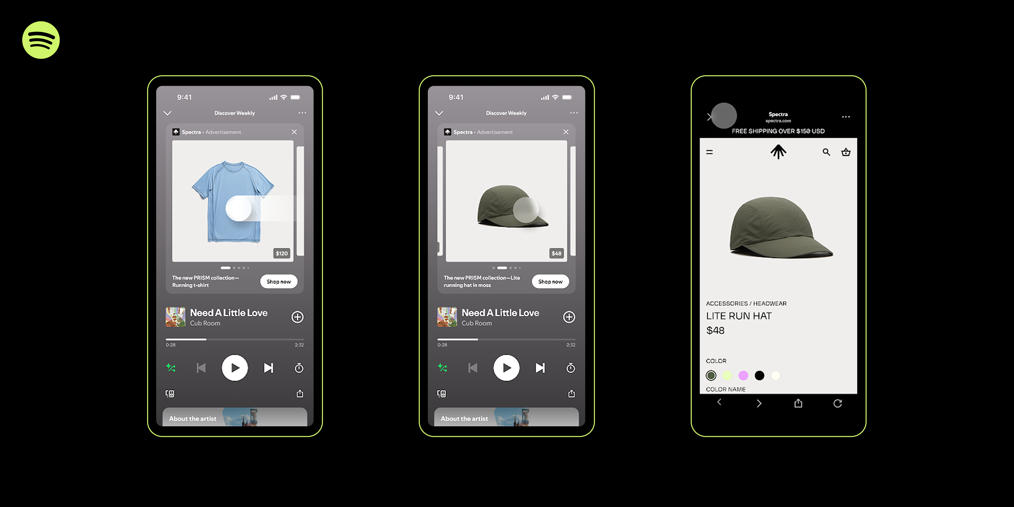 Spotify testet in den USA und Großbritannien derzeit außerdem Carousel Ads – ein swipebares Format mit bis zu sechs CTA-Cards direkt in der Wiedergabeansicht, das visuelle Storys direkt in Spotify erlebbar macht.